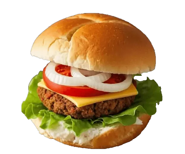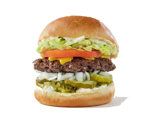This burger featuring a single NZ premium Beef patty Lettuce, tomato, chopped onion, relish, pickles, mustard and mayonnaise.
