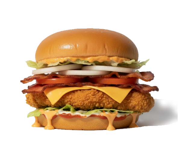 Fried chicken fillet with bacon, American cheese, lettuce, tomato, onion, special sauce, on a brioche bun.