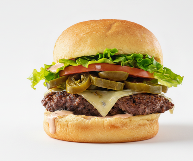 Smokin’ hot! This burger features a single NZ premium Beef patty grilled to perfection and topped with American cheese,jalapenos, lettuce, tomato and our Smokin' Chipotle Ranch and siracha.